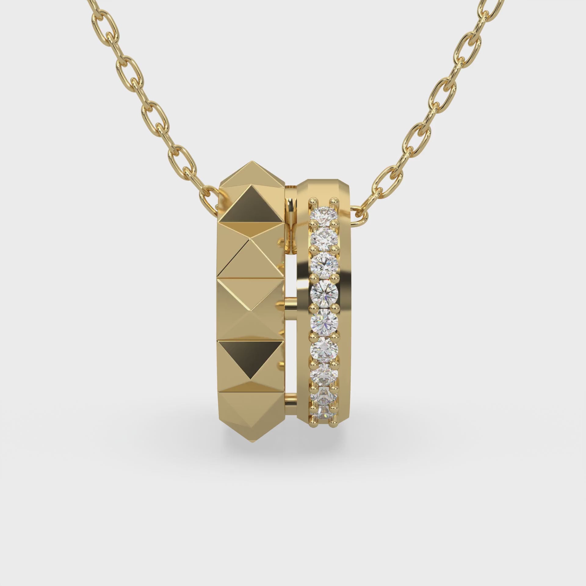 The Earth Pendant Ascent dazzles on any neckline. Nine round diamonds on a side x side ring design suspended by a 20, 18 and 16 inch adjustable 1.8mm chain.